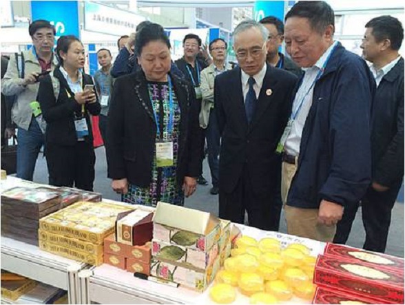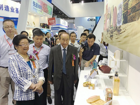 On August 30, 2017, Li Yongwu, president of China Petroleum and Chemical Industry Association, listened to the staff’s introduction to bee sandalwood soap during the 16th China International Chemical Exhibition.