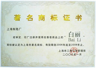 2006年1月,白丽香皂被上海市工商行政管理局授予上海市著名商标称号