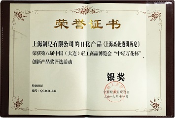 2016年11月,上海药皂高级透明药皂获评第八届中国(大连)轻工商品博览会创新产品银奖。