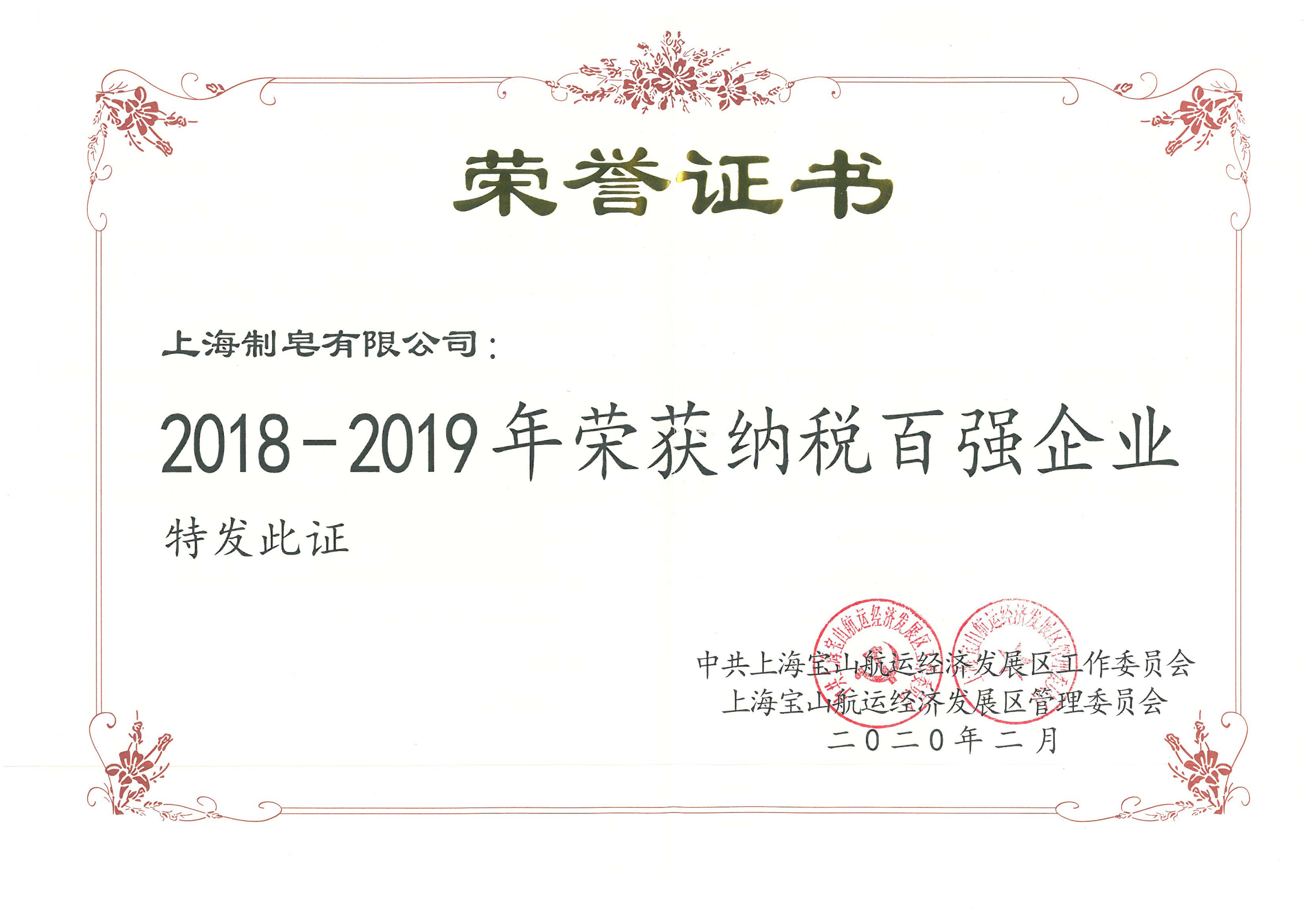 2020年2月,上海制皂厂有限公司获评2018-2019年上海宝山航运经济发展区纳税百强企业。