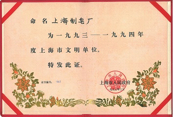 · 1993年4月,上海制皂厂被上海市人民政府评为上海市文明单位。